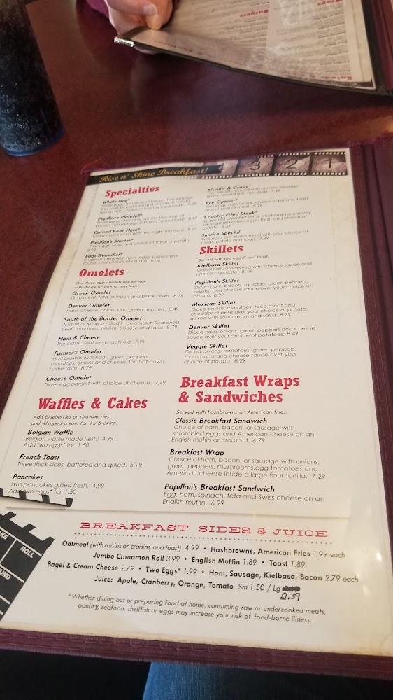 The menu at Papillon's Restaurant reflects a wide array of homestyle favorites. Breakfast features items like corned beef hash, eggs benedict, and hearty skillets. Omelet lovers can choose from various fillings, including Greek and Denver styles. For those who crave something sweet, the jumbo waffles, pancakes, and French toast will satisfy any craving. Lunch offers delicious wraps and sandwiches that are perfect for a quick bite. Each dish is crafted with care, ensuring every visit provides comfort and satisfaction. Papillon’s menu emphasizes simplicity and quality, focusing on traditional flavors that resonate with diners.